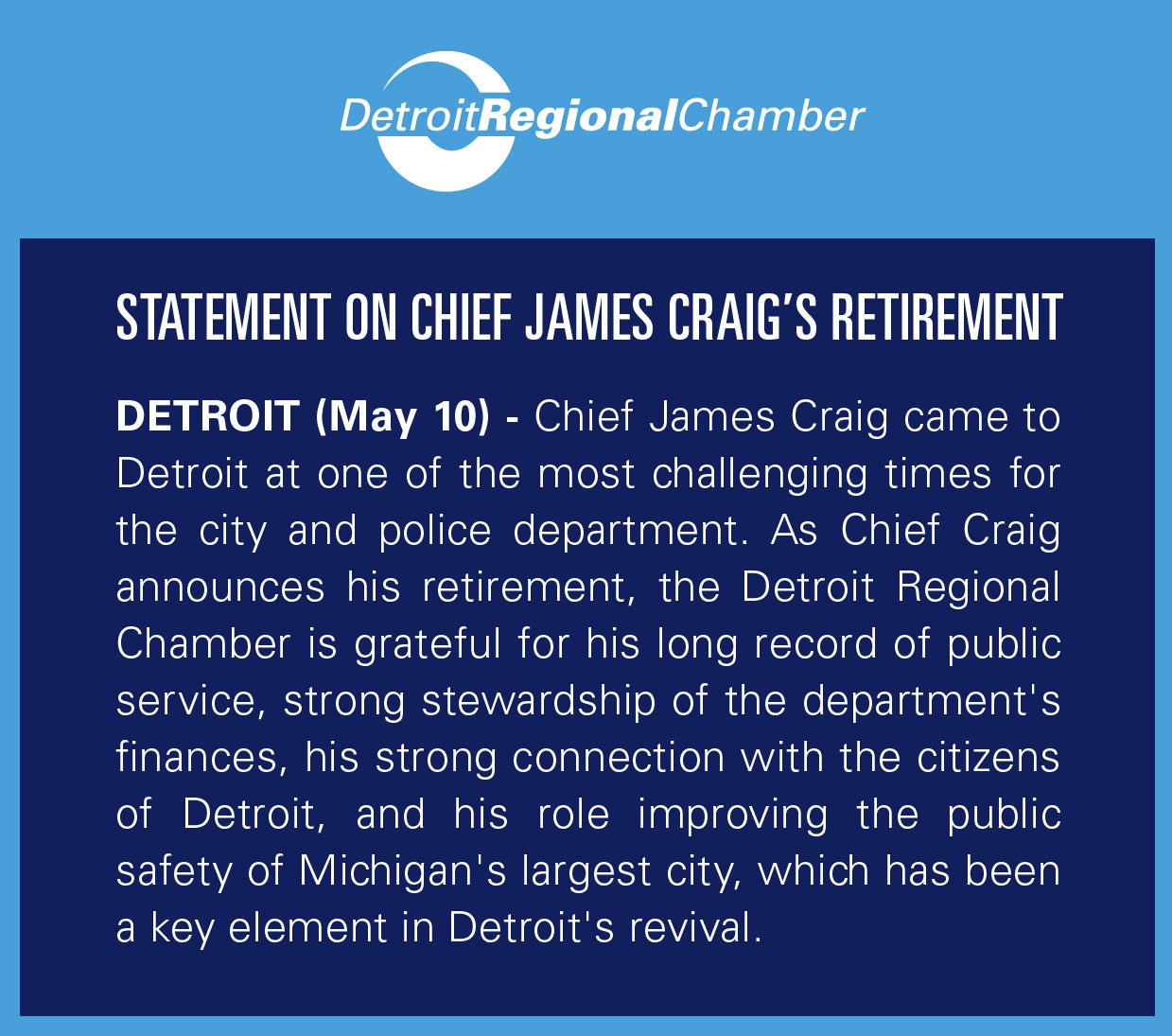 Chamber President and Chief Executive Officer, Sandy K. Baruah, shared the following statement on Detroit Police Chief James Craig’s retirement announcement.