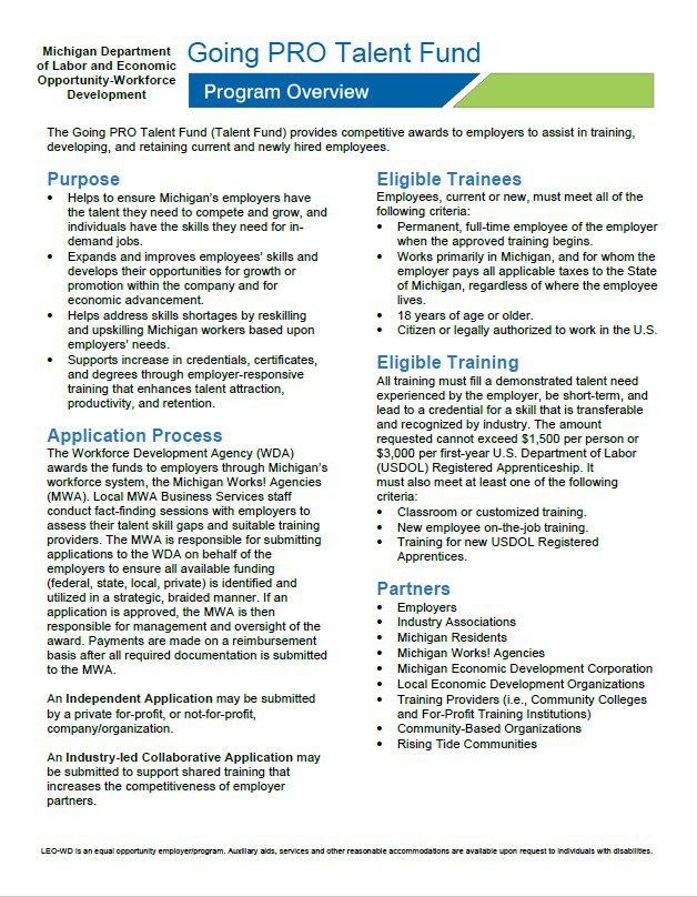 Interested employers must work with their local Michigan Works! Agency (MWA). MWAs provide extensive resources and technical assistance around the Going PRO application and project implementation. While employers will apply through the State’s Going PRO portal, they will need to participate in an initial discussion with a Business Service Representative from their local MWA.