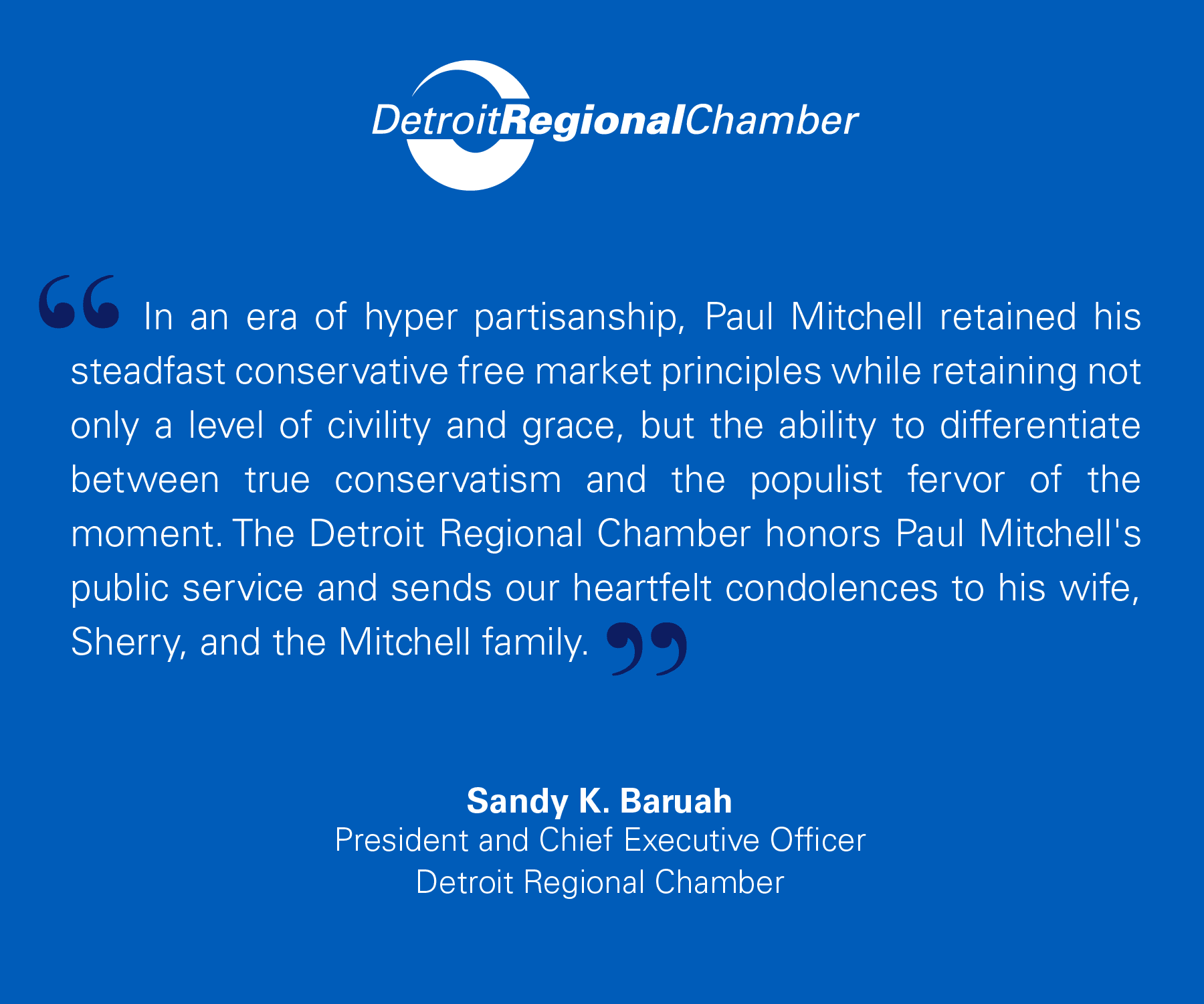 Detroit Regional Chamber President and Chief Executive Officer Sandy K. Baruah issued the following statement on the passing of former Michigan Congressman, Paul Mitchell.