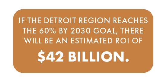 The Chamber, through its Detroit Drives Degrees collective impact initiative, has worked on various strategic and aligned efforts with regional partners in education, business, and philanthropy to create a regional master plan – the Detroit Regional Talent Compact – that serves as a roadmap to reaching the Chambers goal of 60% by 2030 goal.