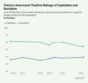 WASHINGTON, D.C. — Americans are more positive toward capitalism than socialism, but the 54% viewing capitalism favorably is down from 60% in 2021 and near that level in most prior years. Americans remain more negative (57%) than positive (39%) toward socialism, with little movement in these attitudes over time.