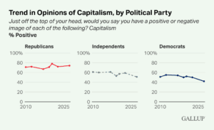 Democrats and independents view capitalism less positively this year, each showing eight-percentage-point declines since 2021. For the first time, less than half of Democrats (42%) view capitalism positively, while a slight majority of independents (51%) still do. Republicans’ views are essentially unchanged, with three-quarters holding a positive opinion.