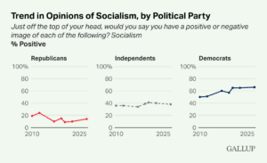 Americans overall continue to be skeptical of socialism, but Democrats are the exception. Since 2016, more Democrats have held positive views of socialism than of capitalism, with the gap expanding to 24 points today. Democrats’ more positive views of socialism occur at a time when many high-profile Democratic officials — most notably, Sen. Bernie Sanders and Rep. Alexandria Ocasio-Cortez, as well as New York City mayoral candidate Zohran Mamdani — have identified themselves as Democratic socialists and advocated policies calling for a significantly expanded government role in economic matters.