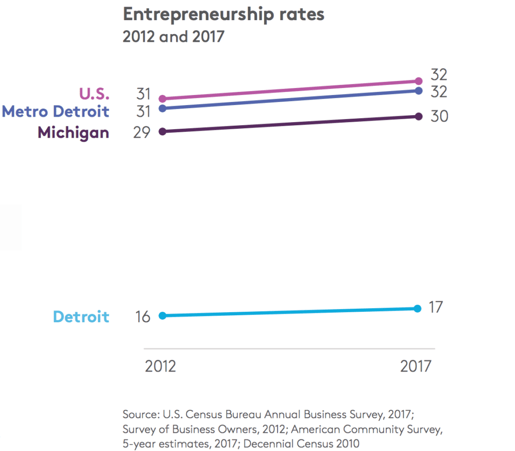 Business and entrepreneurship metrics in the report include entrepreneurship rates per capita, average business size, and capital access for small businesses. Entrepreneurship rates in Detroit are half that of Metro Detroit, as measured by the number of privately held businesses with employees per 1,000 working-age residents. Access to capital differs for small businesses also, with Detroit making up about 9% of the region’s small businesses but accounting for only 6% of the value of the region’s small business loans.