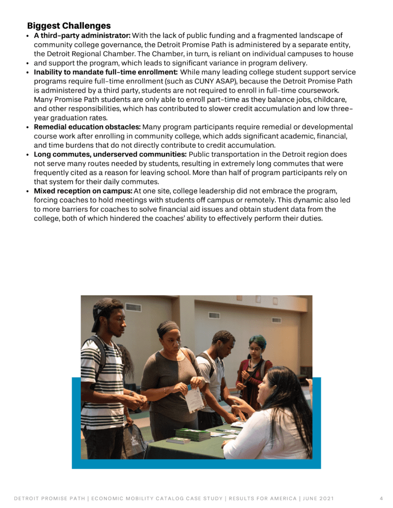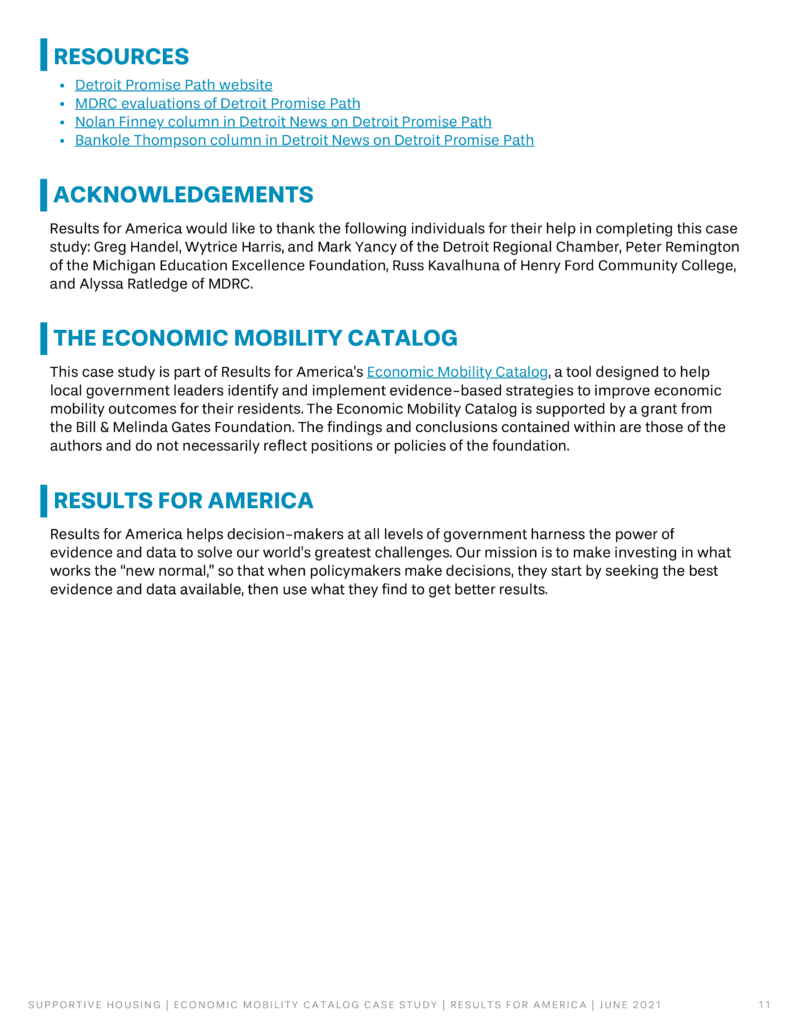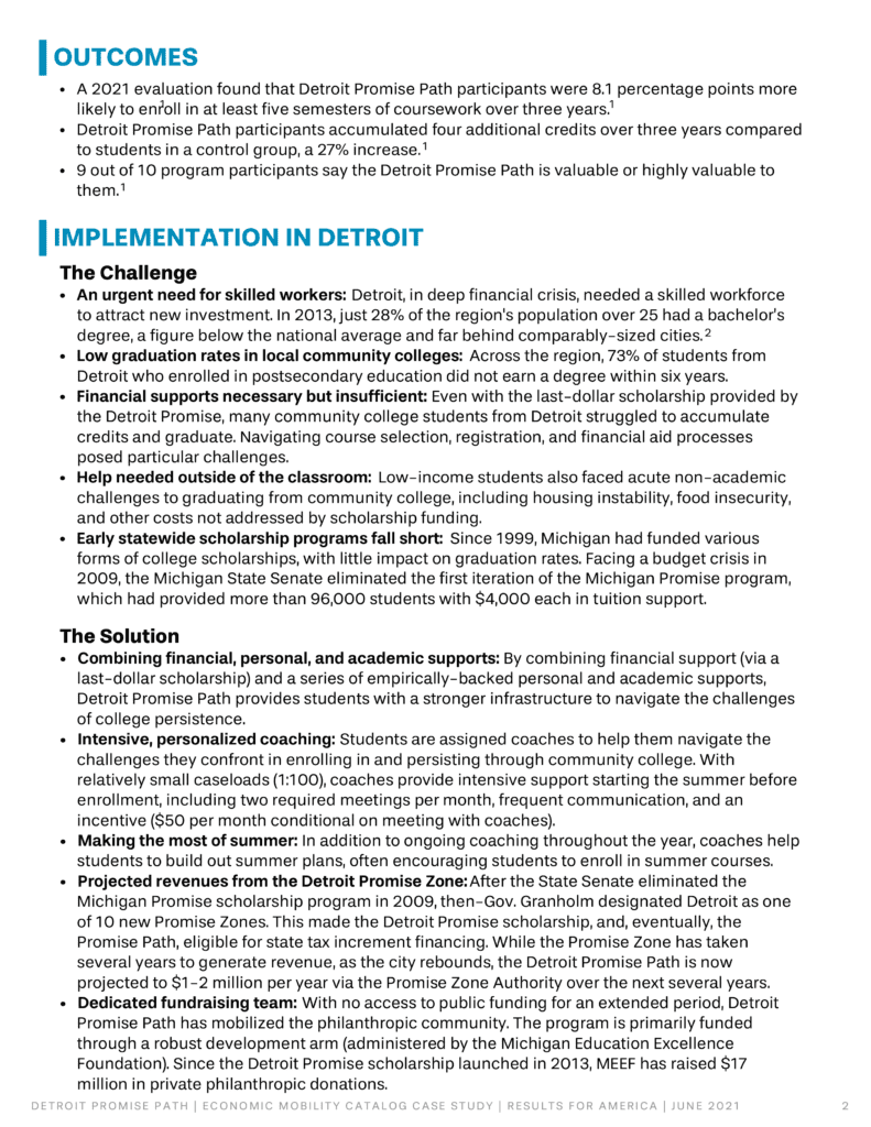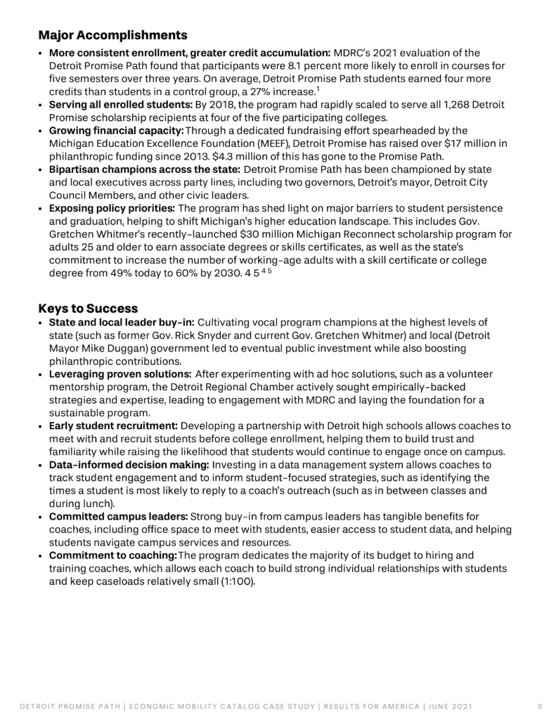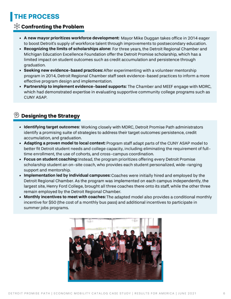 Results for America released a new case study on June 21 focused on the Detroit Promise Path program, which is run in partnership with Detroit Regional Chamber and the Michigan Education Excellence Foundation. Results for America helps decision-makers at all levels of government harness the power of evidence and data to solve our world’s greatest challenges. This case study is part of Results for America’s Economic Mobility Catalog, a tool designed to help local government leaders identify and implement evidence-based strategies to improve economic mobility outcomes for their residents. The Economic Mobility Catalog is supported by a grant from the Bill & Melinda Gates Foundation. The findings and conclusions contained within are those of the authors and do not necessarily reflect positions or policies of the foundation.