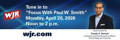 Mark your calendar. On April 20 from noon to 2 p.m., Detroit Regional Chamber President and Chief Executive Officer Sandy K. Baruah will take over the airwaves and fill in for Paul W. Smith as a guest host of WJR 760 AM’s Focus With Paul W. Smith.